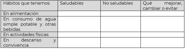 Después elabora con tu familia una tabla en la que distingan los hábitos saludables y los no tan saludables que realizan de manera cotidiana y anoten una propuesta para mejorarlo, cambiarlo o evitarlo, según sea el caso. Puedes guiarte con el siguiente ejemplo: