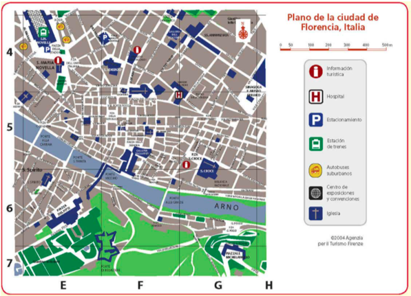 Observar detenidamente el plano de Florencia, Italia, que aparece en la página 29; como podrás darte cuenta, está dividido por una cuadrícula conformada por unas coordenadas geográficas con los números 4, 5, 6 y 7 en vertical y las letras E, F, G y H en horizontal; de esta manera, puedes localizar distintos puntos del plano con la combinación de ambas coordenadas; por ejemplo, la iglesia del S. Spirito se localiza en las coordenadas 6E.