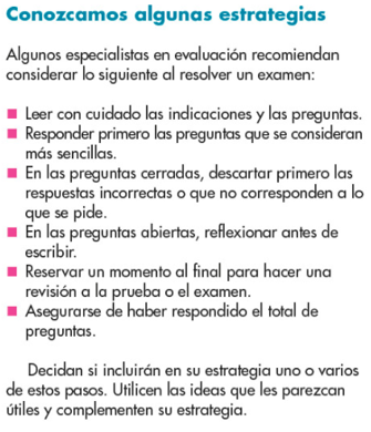 - En tu Libro de Texto de Español, 6º. Grado, Bloque I, tema “Elaborar guías de autoestudio para la resolución de exámenes”, realiza la lectura en voz alta de la página 14, también recupera el texto de tu experiencia con los exámenes que has realizado; así como lo que debes hacer para tener éxito en tus calificaciones. En una cartulina u otro material disponible, escribe la estrategia y los pasos que debes considerar en el momento para hacer un examen en la escuela.