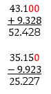 Una vez que completamos con ceros los decimales para que tengan igual número de cifras, podemos sumar o restar como lo hacemos con los números naturales.
