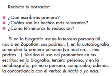 A lo largo de estas sesiones te hemos compartido textos que podrían servirte como referente para redactar tu autobiografía; si por algún motivo no pudiste ver las clases anteriores o quieres repasar o reforzar tus aprendizajes, recuerda que existe la opción de entrar al portal de “Aprende en casa II”; en particular te sugiero que revises la información de las clases sobre biografía y autobiografía, porque seguiremos trabajando en torno a este tema.