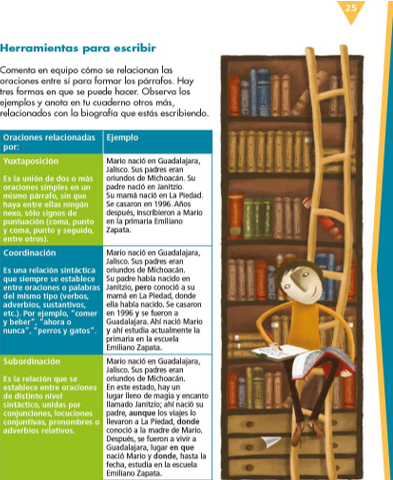 Observa la imagen de la página 25 de tu libro de texto, para identificar los conceptos: yuxtaposición, subordinación y coordinación.