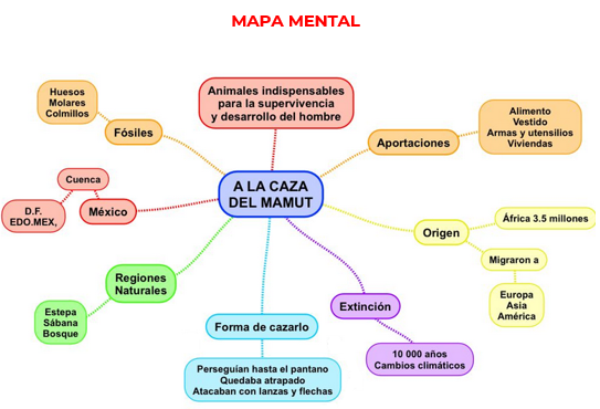 Con base en la información de tu libro de texto de Historia y del video que acabas de ver, realiza un mapa mental con las ideas principales sobre el mamut, por ejemplo: