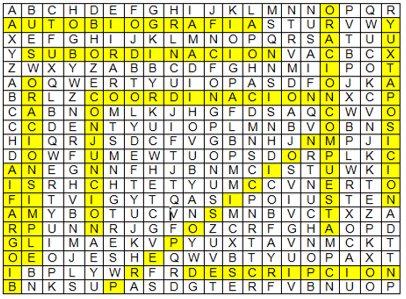 Ahora te invitamos a realizar un juego de sopa de letras para ubicar algunos de los temas que hemos estudiado; mientras señalamos las palabras de la sopa de letras, haremos algunas acotaciones en torno a las mismas palabras (por ejemplo, lo relativo a la acentuación de las palabras, aunque estén escritas con mayúsculas). Una vez concluida la sopa de letras, acentuaremos las palabras de la lista de búsqueda.
