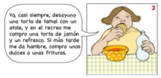 En la tercera imagen vemos a una niña que dice: “Yo casi siempre, desayuno una torta de tamal con un atole, y en el recreo me compro una torta de jamón y un refresco, si más tarde me da hambre, compro unos dulces o unas frituras” ¿Con qué derecho lo relacionamos? y ¿Qué podríamos hacer?