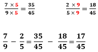 Entonces, ¿Cuánto se excede o se pasa 7/9 de 2/5? El resultado es 17/45.