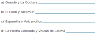 Lee la consigna del desafío, que dice: Si la escala del siguiente mapa es 1:1 000 000, calcula la distancia real aproximada, en kilómetros, entre los cerros: Grande y La Ocotera; El Peón y Alcomún; Espumilla y Volcancillos; La Piedra Colorada y el Volcán de Colima.