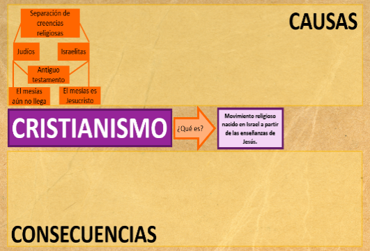 Ahora en la sección de causas anota “Separación de creencias religiosas entre judíos y primeros cristianos. Los judíos no esperaban a un mesías y los primeros cristianos, sí.