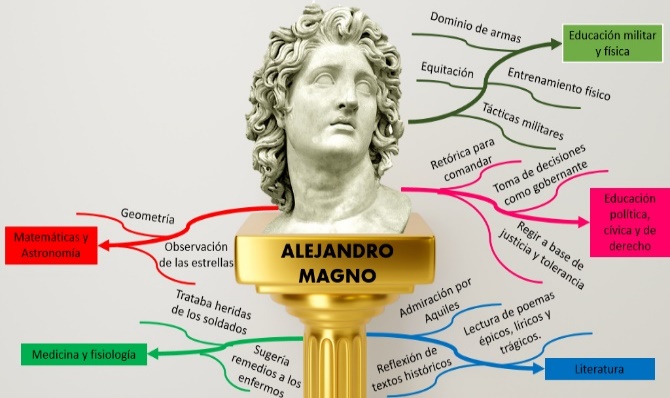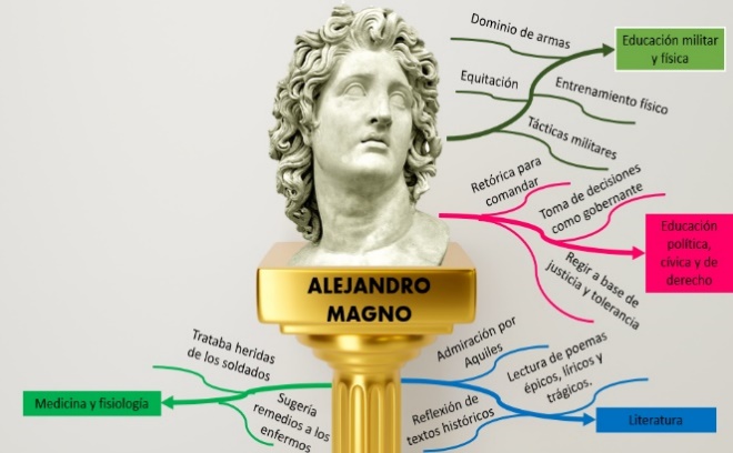De Alejandro Magno se destaca su genio militar y sus conquistas, pero casi no se menciona su educación, la cual fue determinante en el desarrollo de ideas, valores y conductas de una persona.