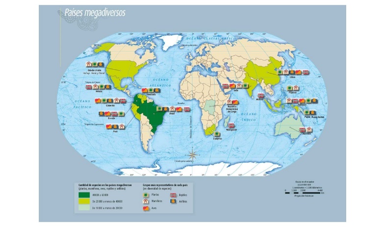 Los países megadiversos se encuentran cerca de los trópicos o tienen disponibilidad de agua para el desarrollo de ecosistemas. En el mapa de la página 59. Están señalados en tres colores distintos, dependiendo de cuántas especies viven en ellos contando plantas, anfibios, mamíferos, reptiles y aves.