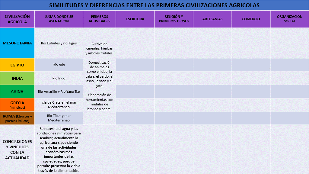 - Mesopotamia: Desarrolló la agricultura y la domesticación de animales cerca de los ríos Tigris y Éufrates (7,000 a.C aprox.)