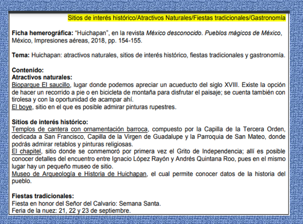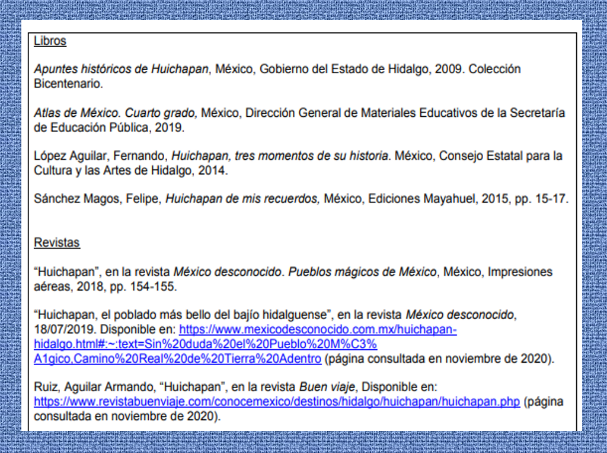 A continuación, te mostramos de nuevo la bibliografía del reportaje sobre Huichapan, Hidalgo, así como la ficha de trabajo.