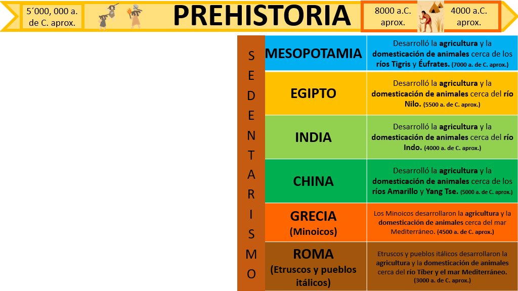 Por eso decimos que el inicio de la sedentarización y las primeras civilizaciones agrícolas ocurre entre el 10,000 a.C y el 3,200 a.C, que es cuando se inventa la escritura.