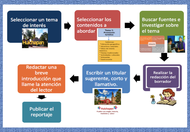 Observa el siguiente diagrama para recordar los pasos que seguimos para elaborar nuestro reportaje sobre Huichapan.