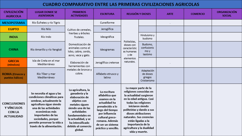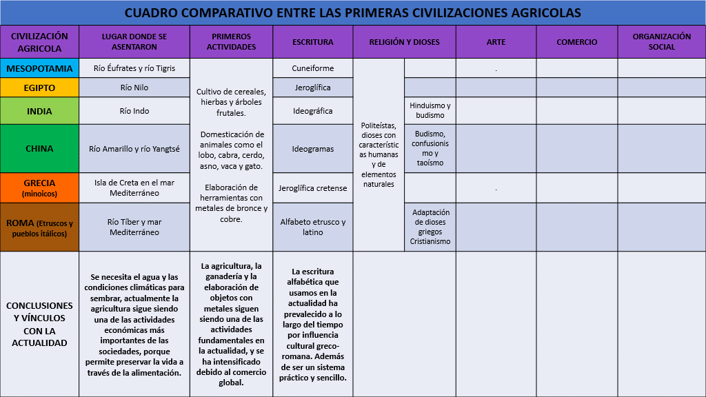 En tu cuadro comparativo puedes registrar que las civilizaciones antiguas eran politeístas, y que sus dioses poseían características humanas y aludían a elementos naturales.