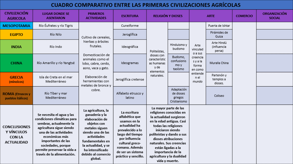 Durante la clase anterior, registramos que en el Neolítico, las civilizaciones que hemos estudiado se asentaron gracias al descubrimiento de la agricultura y la domesticación de animales. Algunas de estas civilizaciones descubrieron la escritura y comenzaron a utilizarla antes que otras; eso potenció su desarrollo.
