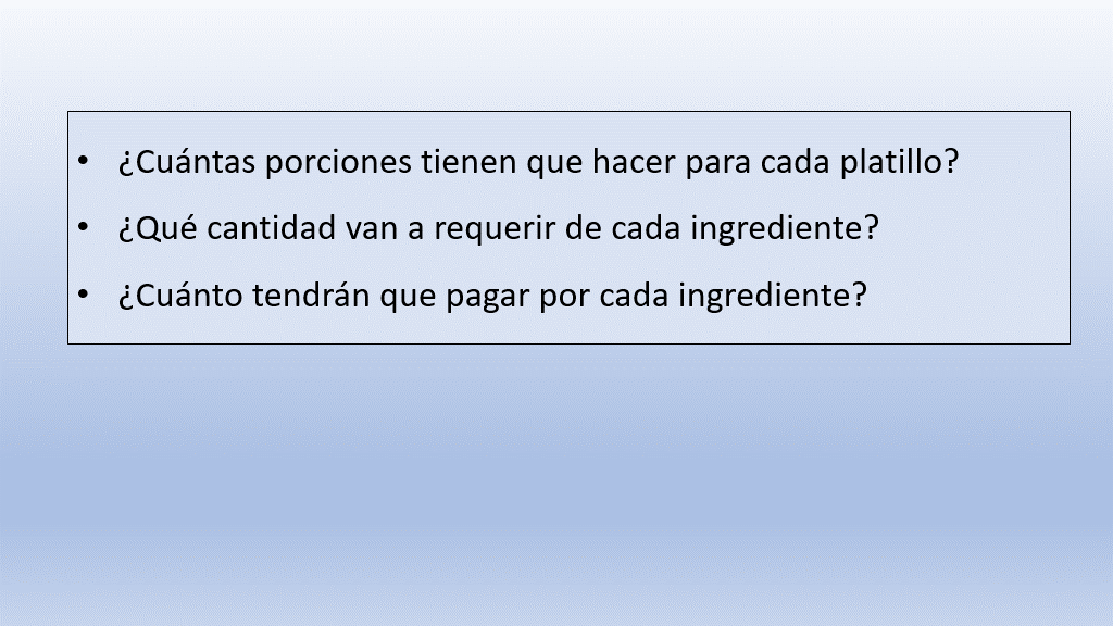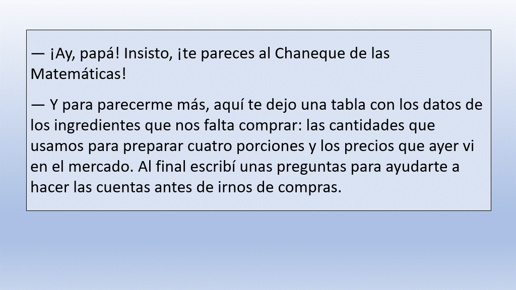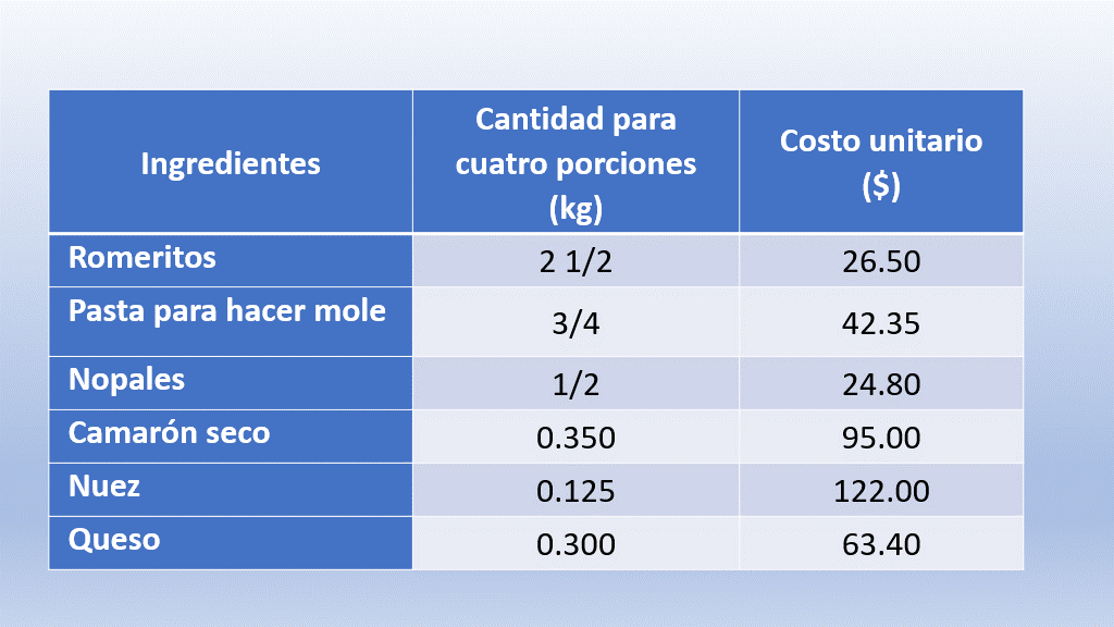En la siguiente tabla se encuentran los datos de los ingredientes que nos falta comprar: Las cantidades que usamos para preparar cuatro porciones y los precios que ayer vimos en el mercado.