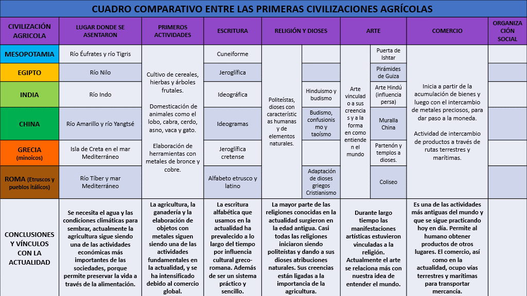 Puedes notar que ambas civilizaciones fueron de las primeras en sedentarizarse y comenzar a organizarse social y políticamente. Al mismo tiempo, otras civilizaciones contaban con pequeñas aldeas asentadas cerca de ríos o mares.