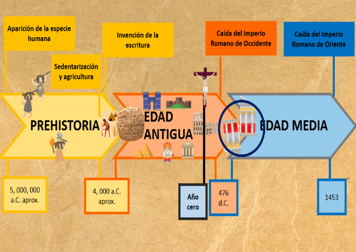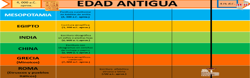 La Edad Antigua abarca desde la invención de la escritura en el año 3200 a. de C. aproximadamente a la caída del Imperio Romano de Occidente, lo que señala el inicio de la Edad Media, en el 476 d. de C.