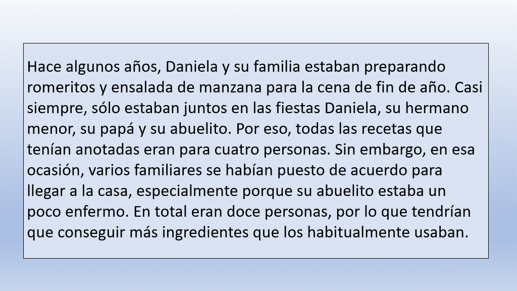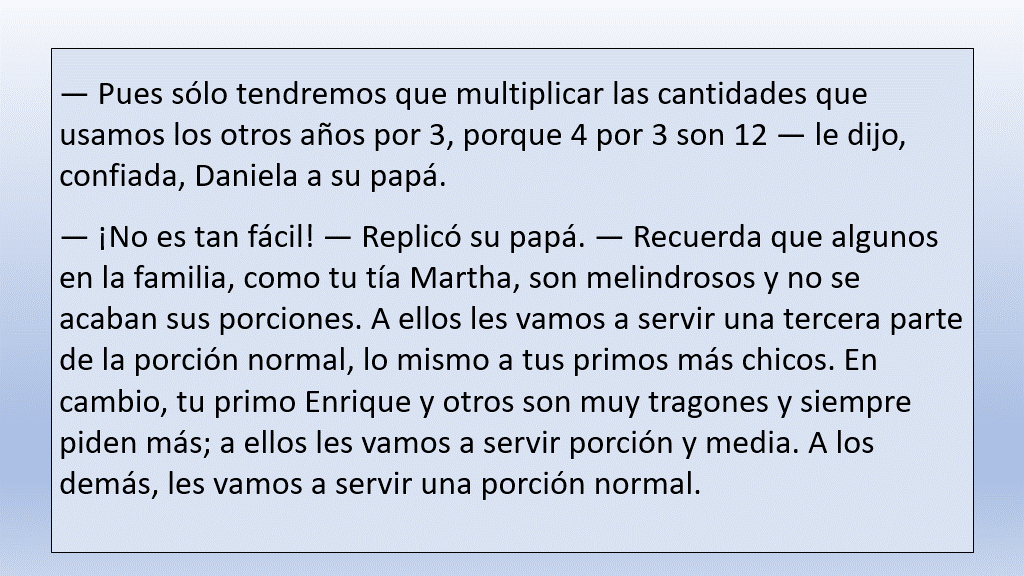 - Cuando terminó de hacer las cuentas, Daniela pensó, que mejor sí le pediría permiso a su papá de invitar a Juan. ¡Total! ¡Él estaba entre los que comían poquito!