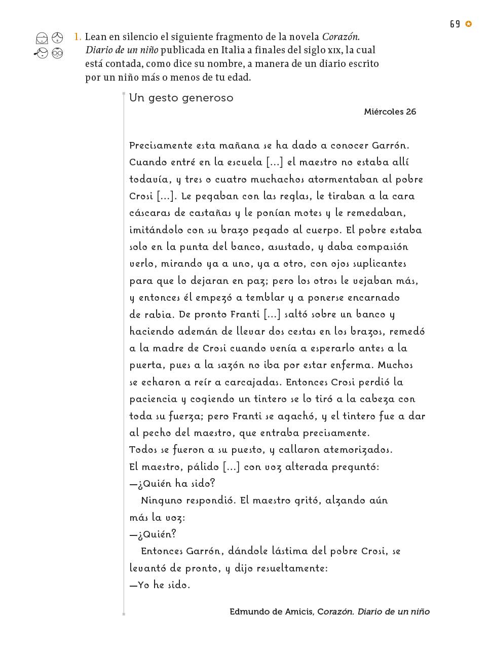 Para reflexionar sobre este aspecto revisa tu libro de texto de Formación Cívica y Ética de 6º grado, en la página 69, ahí encontrarás un fragmento de la novela Corazón. Diario de un niño, obra del italiano Edmundo de Amicis, a finales del siglo XIX, la cual está contada, como dice su nombre, a manera de un diario escrito por un niño, más o menos de tu edad.