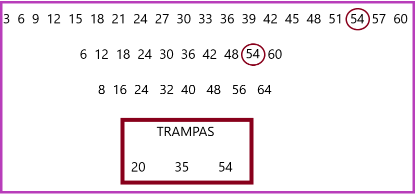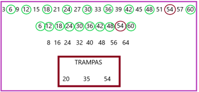¡Pasó la primera trampa sin caer en ella! Sigue 30, 36 y ya pasó la segunda trampa, vas por la última: 42, 48, 54 ¡Oh, no! volvió a caer en la misma trampa.