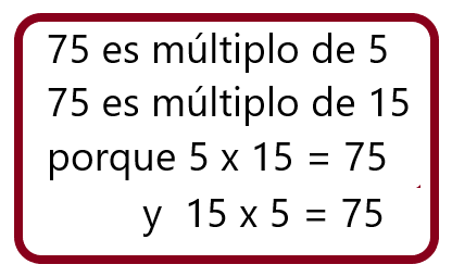 Por ejemplo, si necesitas encontrar un múltiplo cualquiera de 5, lo multiplicas por cualquier número natural; en este caso se multiplicó por 15, entonces 5 x 15 es 75, así puedes asegurar que 75 es múltiplo de 5, pero si te fijas bien también es múltiplo de 15, pues estás multiplicando a 15 por otro número natural.
