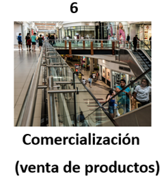 Por último, y ahora sí, esta imagen corresponde a la venta de los productos. Comúnmente, este paso se lleva a cabo en tiendas, mercados, tianguis, o como lo hemos visto en la actualidad, ventas realizadas en “línea” en tiendas virtuales. A esta etapa del proceso se le conoce como “comercialización”.