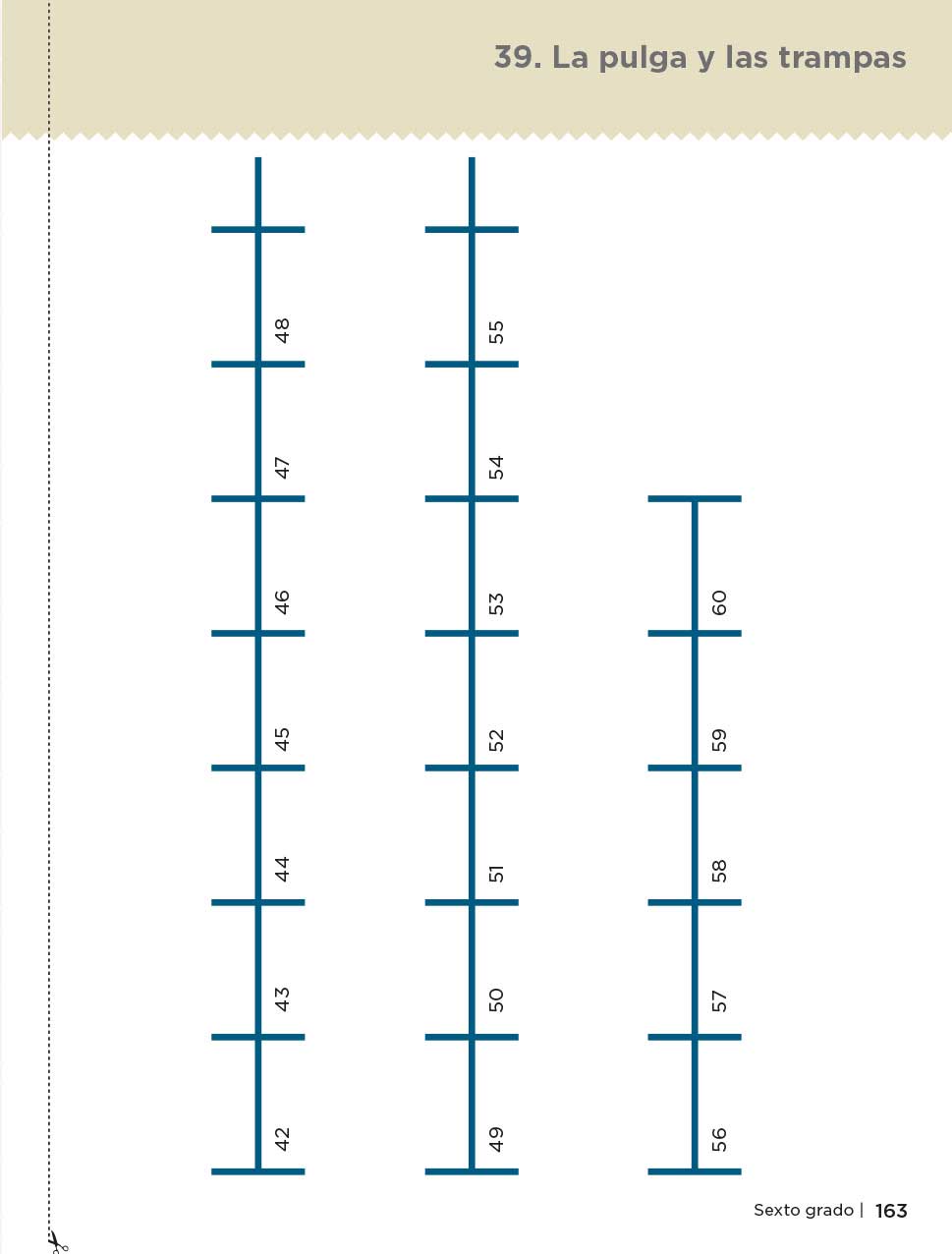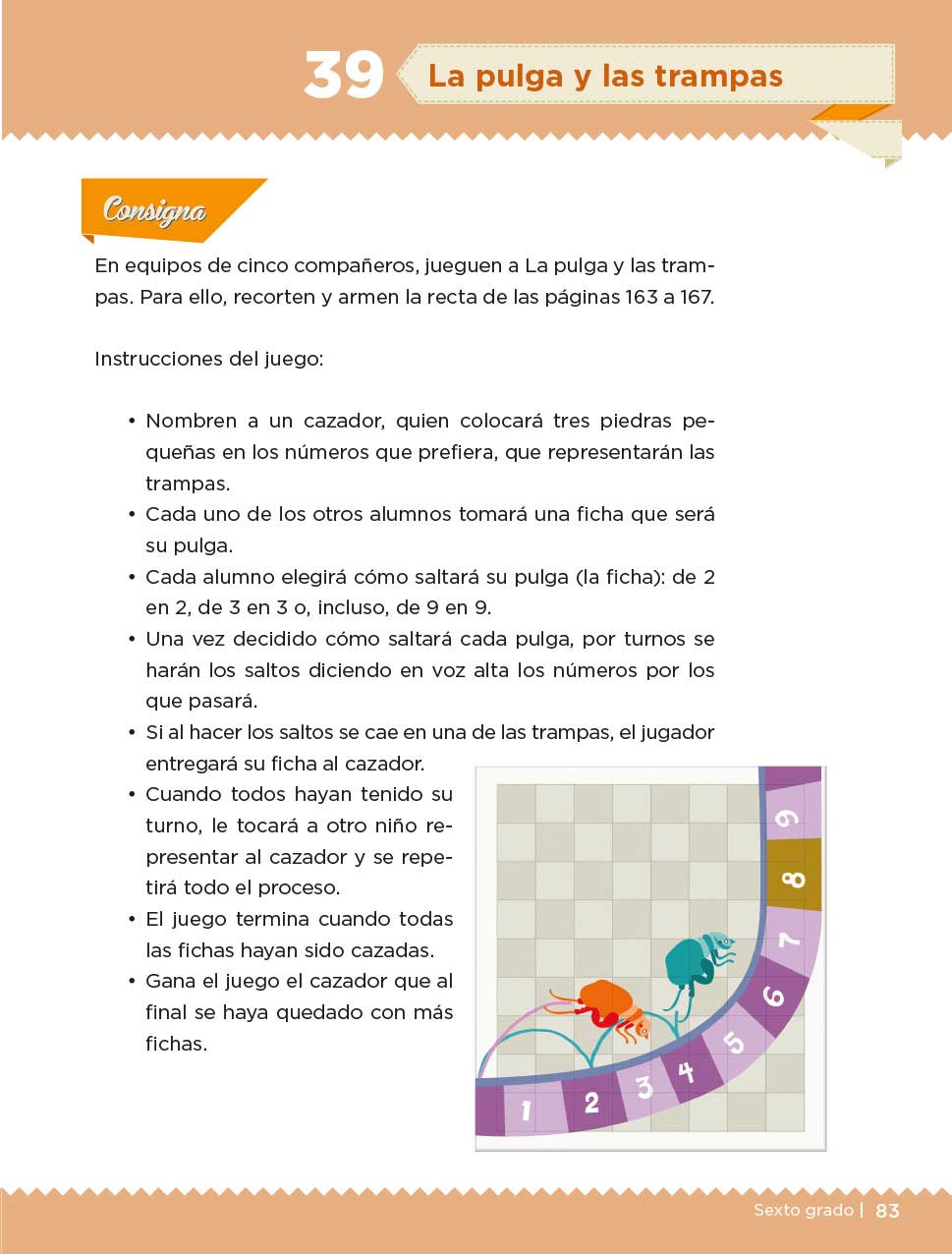 Consigna: En equipos de cinco compañeros, jueguen a La pulga y las trampas, para ello, recorten y armen la recta de las páginas 163 a 167.