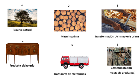 El proceso productivo o proceso de transformación se compone de diferentes pasos o etapas que son llevadas a cabo en distintos momentos por varias personas. Para que quede más clara la información identifica el proceso de producción de la madera, para ello observa las imágenes siguientes: