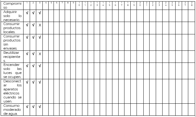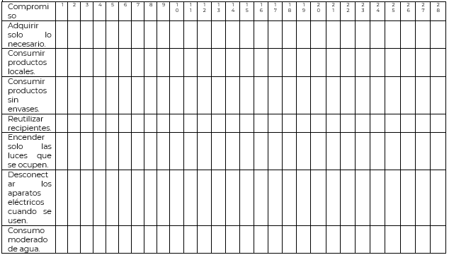Necesitarás una hoja de papel en la que trazarás una tabla con varias columnas. En la primera columna vas a colocar la palabra “Compromiso”, y en las celdas de abajo escribirás algunas de las acciones que puedes practicar para el consumo sustentable. Hacia la derecha indica los días del mes.