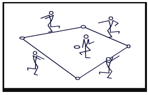 Paso 3. Cada uno de los participantes debe colocarse en una esquina y el participante que queda debe colocarse en el centro. Se trata de intercambiar lugares velozmente y evitar quedar en el centro.