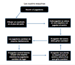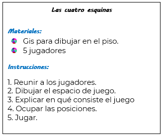 Primero identifica el título: “Las cuatro esquinas”. Ahora ¿Cuáles serán los materiales que se necesitan? solo un gis para dibujar en el piso. Y las instrucciones, es decir, ordenar los pasos del juego en ideas muy bien explicadas.