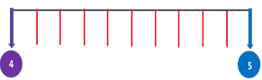 Aquí tienes el 4 y acá está el 5. En medio están las rayitas, son 9 rayitas y cada una representa una parte de un natural, es decir: un número decimal. Si comienzas en el 4, al avanzar hacia la siguiente rayita, ¿En qué número estarás?