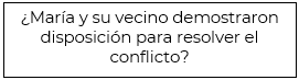 Con seguridad ella se sintió muy frustrada. Recibió una respuesta cortante, tal vez su vecino no la dejó ni hablar, le cerró la puerta en la cara y ya no pudo dormir. ¿De alguna forma, demostraron ella o su vecino disposición para resolver el conflicto?