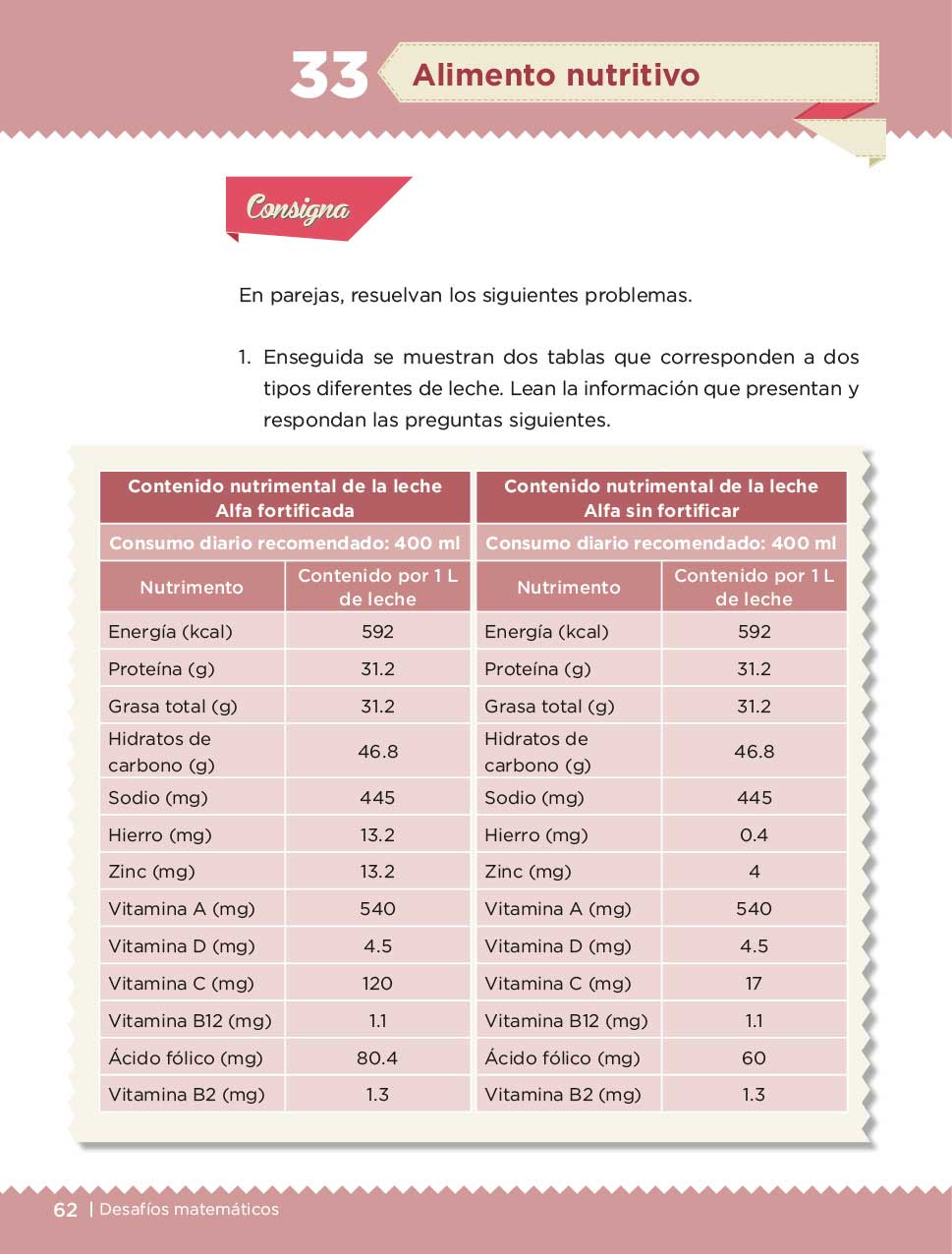 Estas tablas dan la información nutricional de lo que consumimos, con la intención de lograr equilibrar nuestro consumo de ciertas sustancias que, en ocasiones, afectan nuestra salud y nuestro estado de ánimo. Este tema nos dará información para contestar el desafío 33 del Libro de Texto Gratuito, considerado en las páginas 62, 63, 64 y 65.