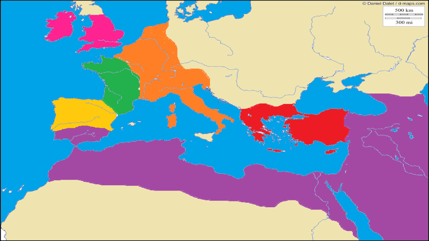 Puedes comenzar por colorear en tu mapa el continente europeo, y después ubicar los principales reinos que aparecieron allí durante la Edad Media. Con otro color, puedes ubicar el espacio geográfico donde se desarrolló el famoso Imperio Bizantino, el cual llegó a abarcar lo que actualmente es Turquía, la península de los Balcanes, Asia Menor, Siria, Palestina, Egipto y las islas del Mediterráneo oriental.