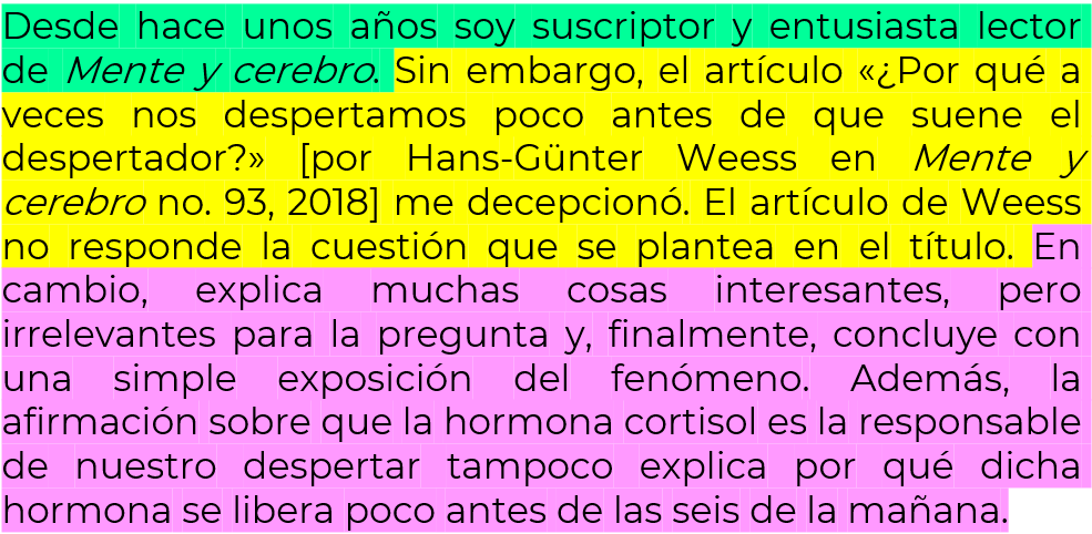 Observa las líneas subrayadas con azul el autor de la carta explica las razones por las que la lectura del artículo “¿Por qué a veces nos despertamos poco antes de que suene el despertador?” lo decepcionó. Mira: