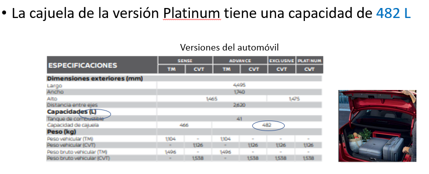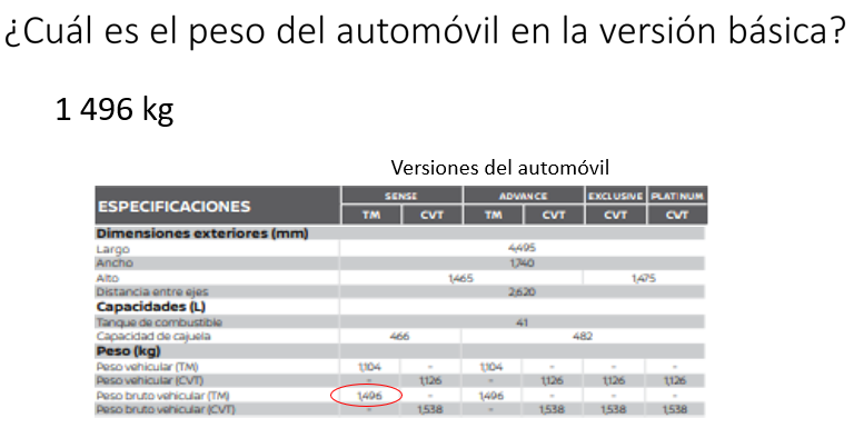 Identifica que todas contiene algo dentro. Eso que permite que tengan algo dentro de ellas se conoce como capacidad. Y ¿cuál es el peso del automóvil en la versión básica?