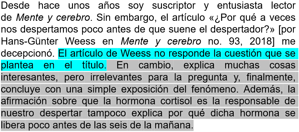 Es claro su argumento: “no responde la cuestión que se plantea en el título”, y, en cambio, explica otros asuntos en la parte resaltada con gris; además, por lo dicho por el autor de la carta, en el artículo también se omite una idea central, la relacionada con la hormona cortisol.