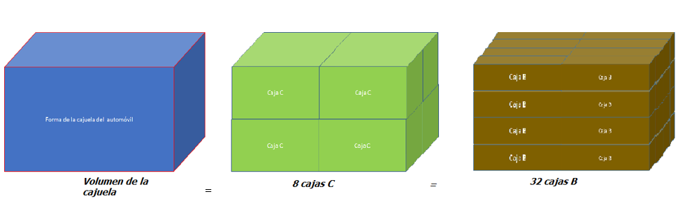 En la sesión anterior, encontraste el número de cajas iguales que necesitas para ocupar el mismo espacio que un objeto tiene. En ese caso, usaste como caja modelo la cajuela de un automóvil y observaste cuántas cajas de diferentes tamaños podían caber en ella.