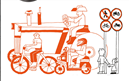 Hay un tractor, una bicicleta y una motocicleta circulando por la misma vía y dos personas intentando cruzar, pero se les impide el paso.