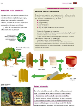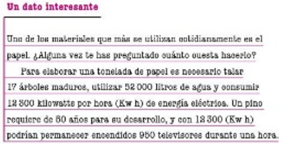 También debes considerar que la producción de papel nos aporta muchos beneficios, pero también tiene implicaciones graves en el ambiente. En la misma página del libro de texto, hay «Un dato interesante».