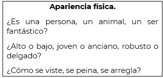 Empieza por las características físicas, retoma las preguntas, ¿Es una persona, un animal, un ser fantástico? ¿Alto o bajo, joven o anciano, robusto o delgado? ¿Cómo se viste, se peina, se arregla?