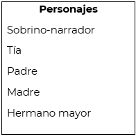 Se puede identificar al hijo/sobrino, quien es el narrador, a la tía, que es en torno a quien gira la historia, al padre, que es hermano de la tía, a la madre, las hermanas y los primos, que nunca se dice cuántos son, y al hermano mayor; aunque en total, son más de treinta personajes ocupados de la tía, según el cuento.