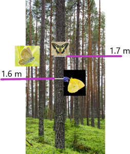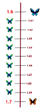 Se identifica que 1.6 m es lo mismo que 1 metro con 6 decímetros y 1.7 m es lo mismo que 1 metro con 7 decímetros, y como cada decímetro tiene 10 centímetros, entonces es como escribir 1 metro 60 centímetros y un metro 70 centímetros, así se podían encontrar entre 60 y 70 varios números. Por lo tanto, la tercera mariposa se pudo haber parado sobre el tronco a una altura de 1.61, 1.62, 1.63, 1.64, 1.65, 1.66, 1.67, 1.68, 1.69 metros.