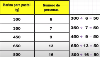 Esa constante de proporcionalidad es la misma que el valor unitario, es decir, que si quieres hacer ese pastel para una persona, deberás usar 50 gramos de harina.