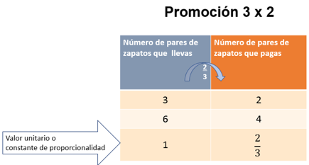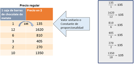 Además con ese valor, llamado valor unitario, se determina lo que se conoce como constante de proporcionalidad, esta constante es el valor de la razón que existe entre las cantidades cuando hay una relación de proporcionalidad directa.