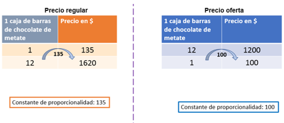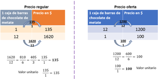 Es importante resaltar que en esta situación se hizo la comparación a partir de conocer el precio regular de una caja de barras de chocolates y calcular su precio de oferta, es decir, se tuvo que determinar en cuánto sale 1 caja de acuerdo con las condiciones de la oferta. En general, cuando se obtiene el precio de lo que cuesta 1 producto se puede calcular el costo para cualquier cantidad de producto, en este caso, eso sirvió para comparar el precio de oferta con el precio regular.