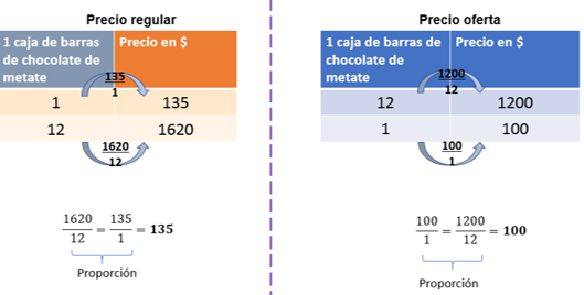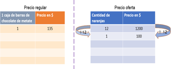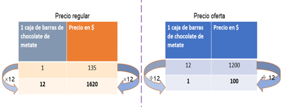 Observa que se conoce el precio regular de una caja de barras de chocolate, por lo tanto, para comparar si es buena la oferta, cuando se quiere comprar 10 o más cajas, se necesita saber en cuánto sale una caja de barras de chocolate de metate con el precio de oferta, para saberlo, debes dividir el precio de oferta entre 12, que es el número de cajas de chocolate.